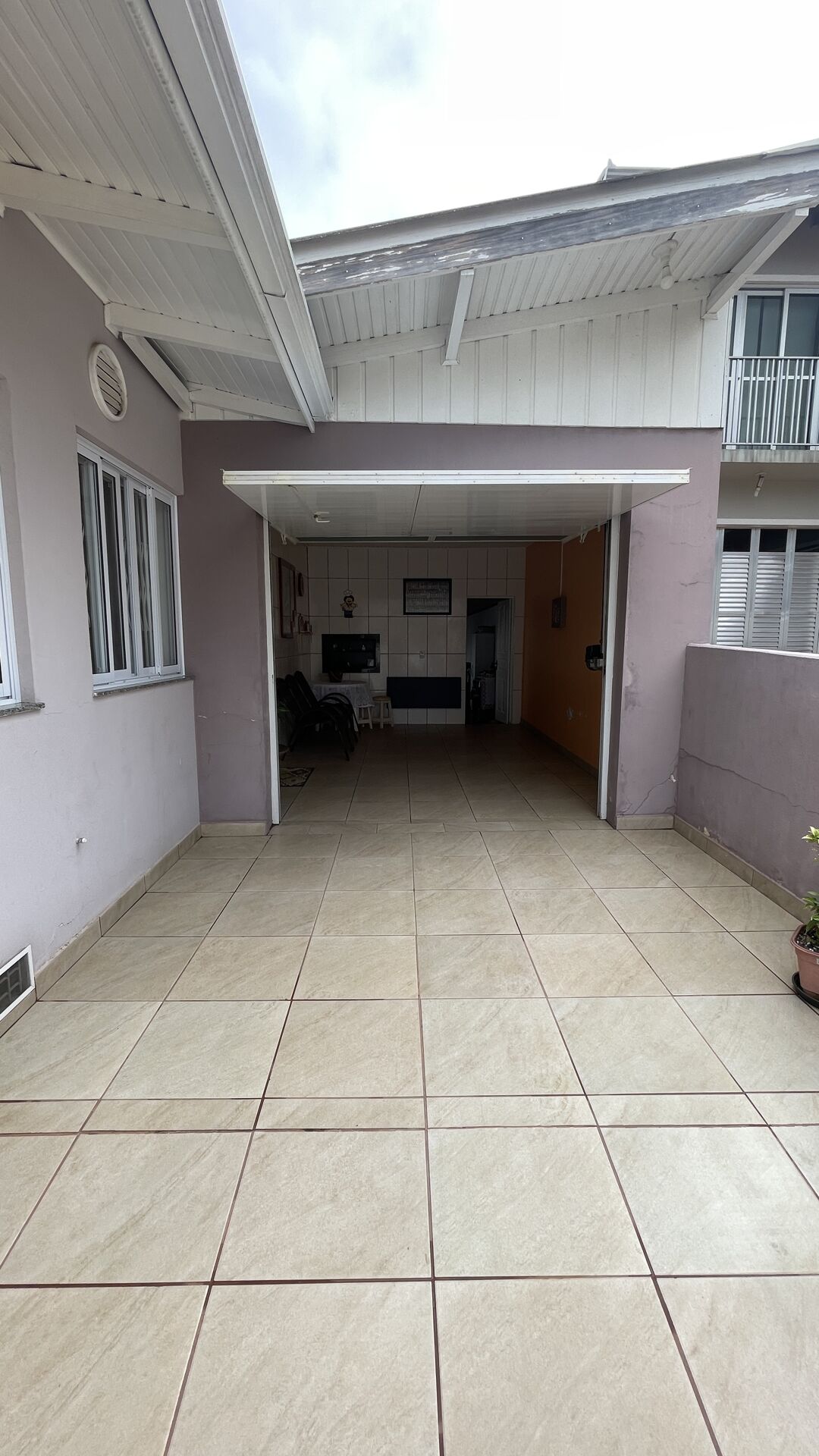 Área de serviço com depósito e lavabo, janelas com grades pantográficas.